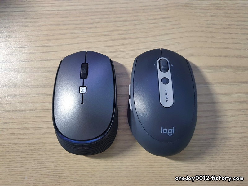 크기 비교를 위해서 내가 지금 메인으로 쓰고 있는 로지텍 M590 마우스랑 같이 두고 찍어봤다. 크기는 비슷한데, 볼륨감은 M590이 좀 더 있는 편이다.